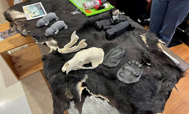 本物のクマの頭骨や毛皮、爪などの試料に触れながら、ツキノワグマについて学びます。